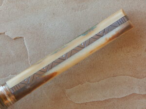 This Bowie is flat ground O1 steel with a clipped point. Blade is 7-1/4 inches long and 1-1/2 inches wide. Guard and frame are 410 Stainless steel. Frame is file worked in tribal pattern. Spacer package is Shibuichi and fine silver. Shibuichi is made in my shop 40/60 silver and copper. Fine silver accent spacer has hammered texture. Fossilized mammoth tusk handle scales and fine silver domed pins. Sheath is loop style and hand tooled, top-grain cowhide. Knife OAL 12.5 inches. Sheath 13.25 inches.